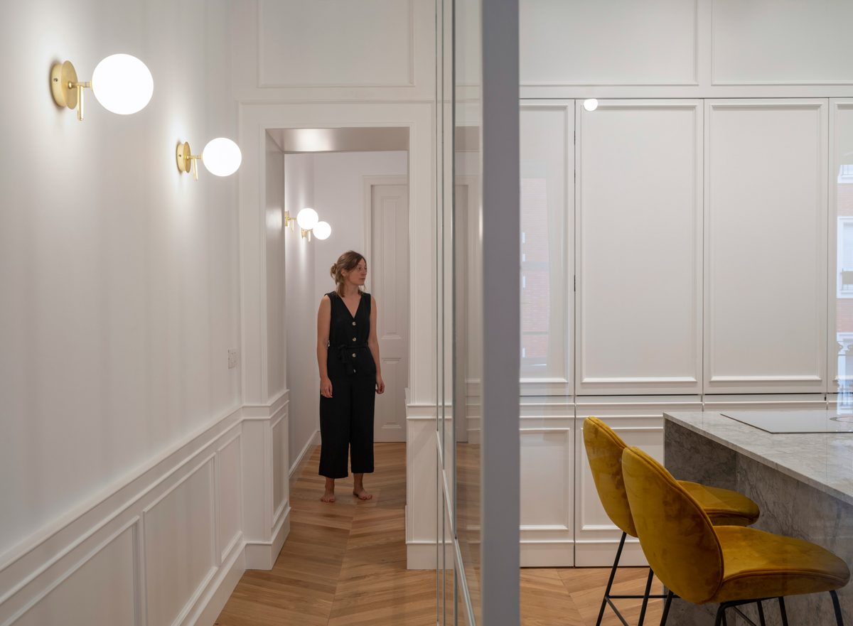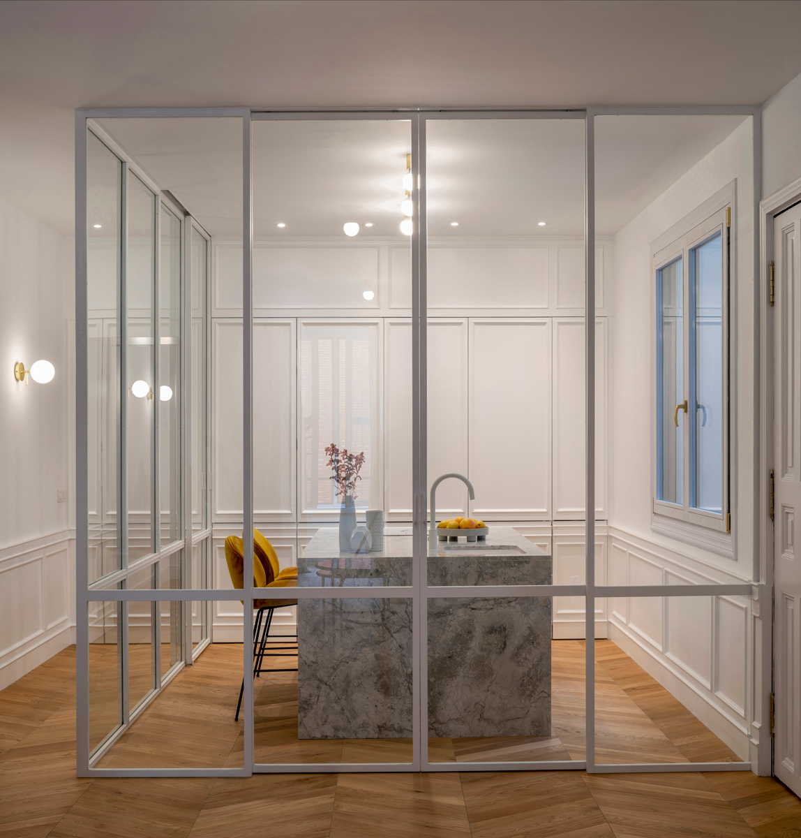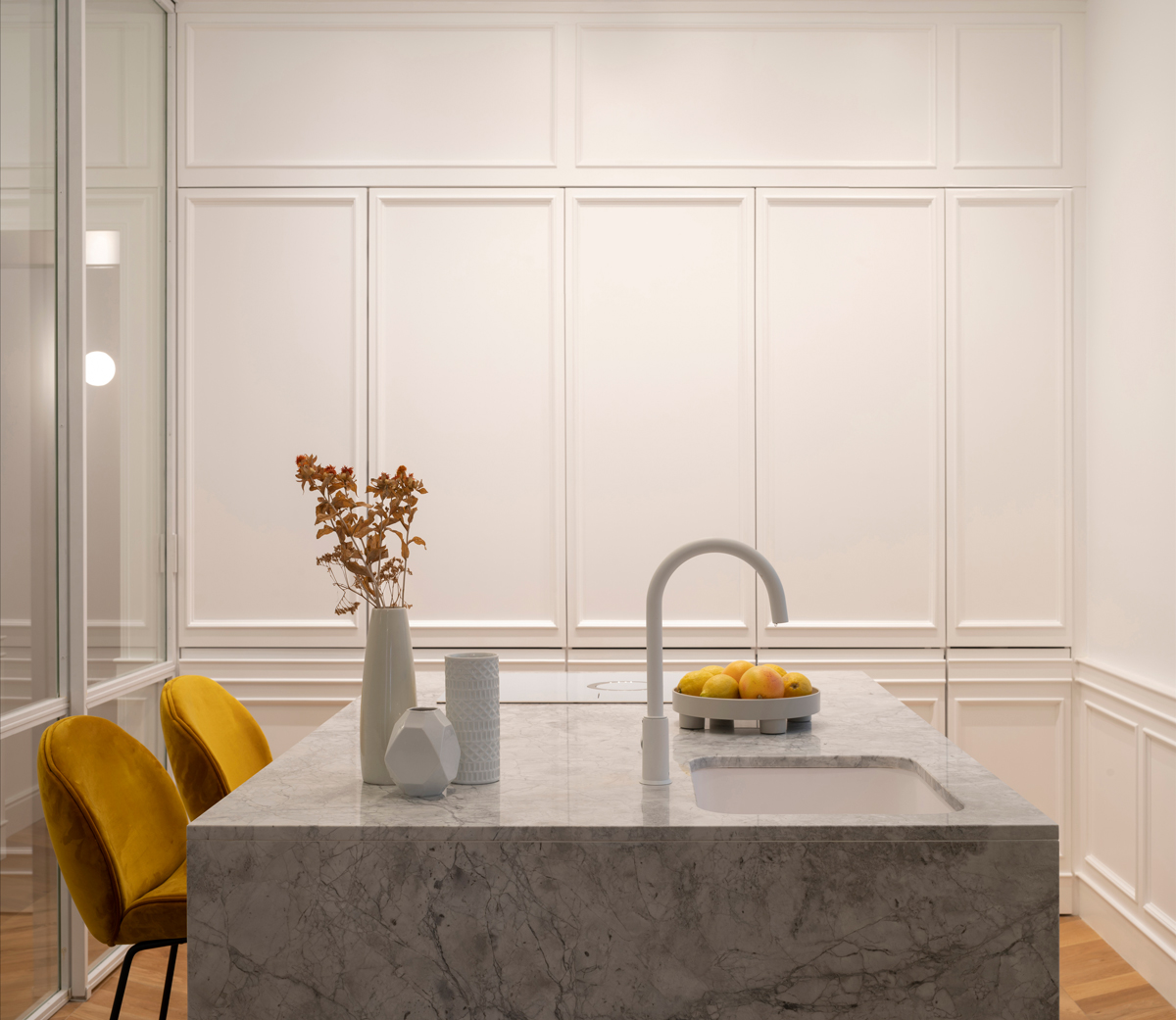 Integramos armarios y electrodomésticos en el frente de puertas molduradas que, a su vez, se integran en el trabajo de carpintería interior de friso y pasos. Isla de cocina en granito con cajones y extracción ocultos.
