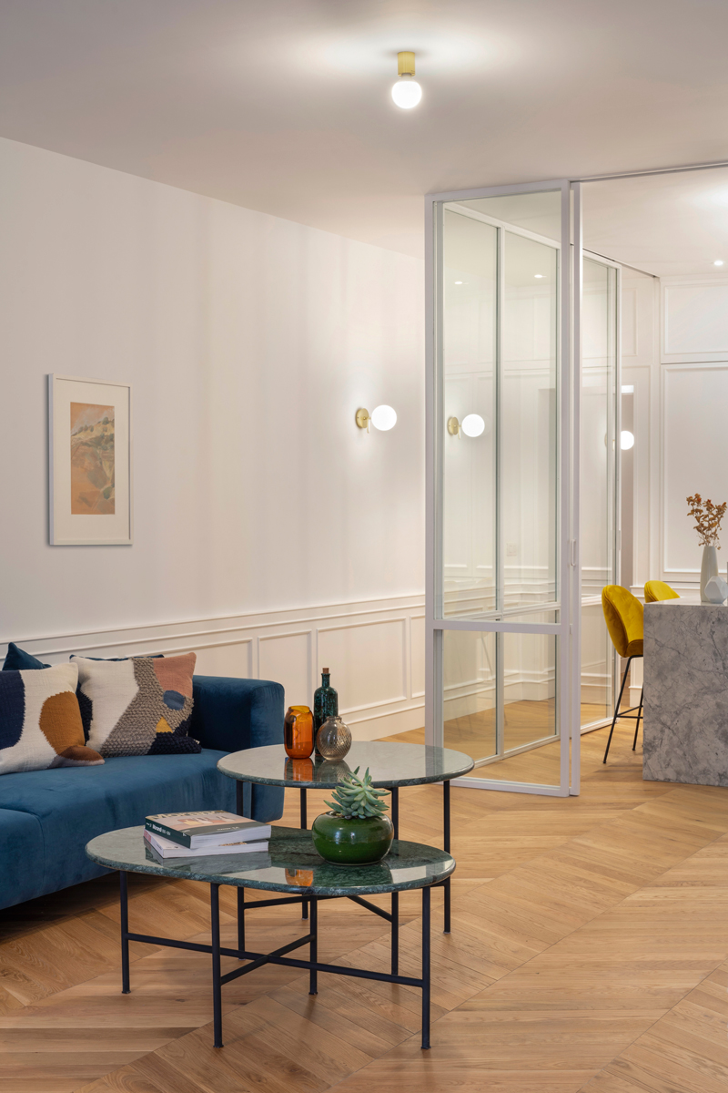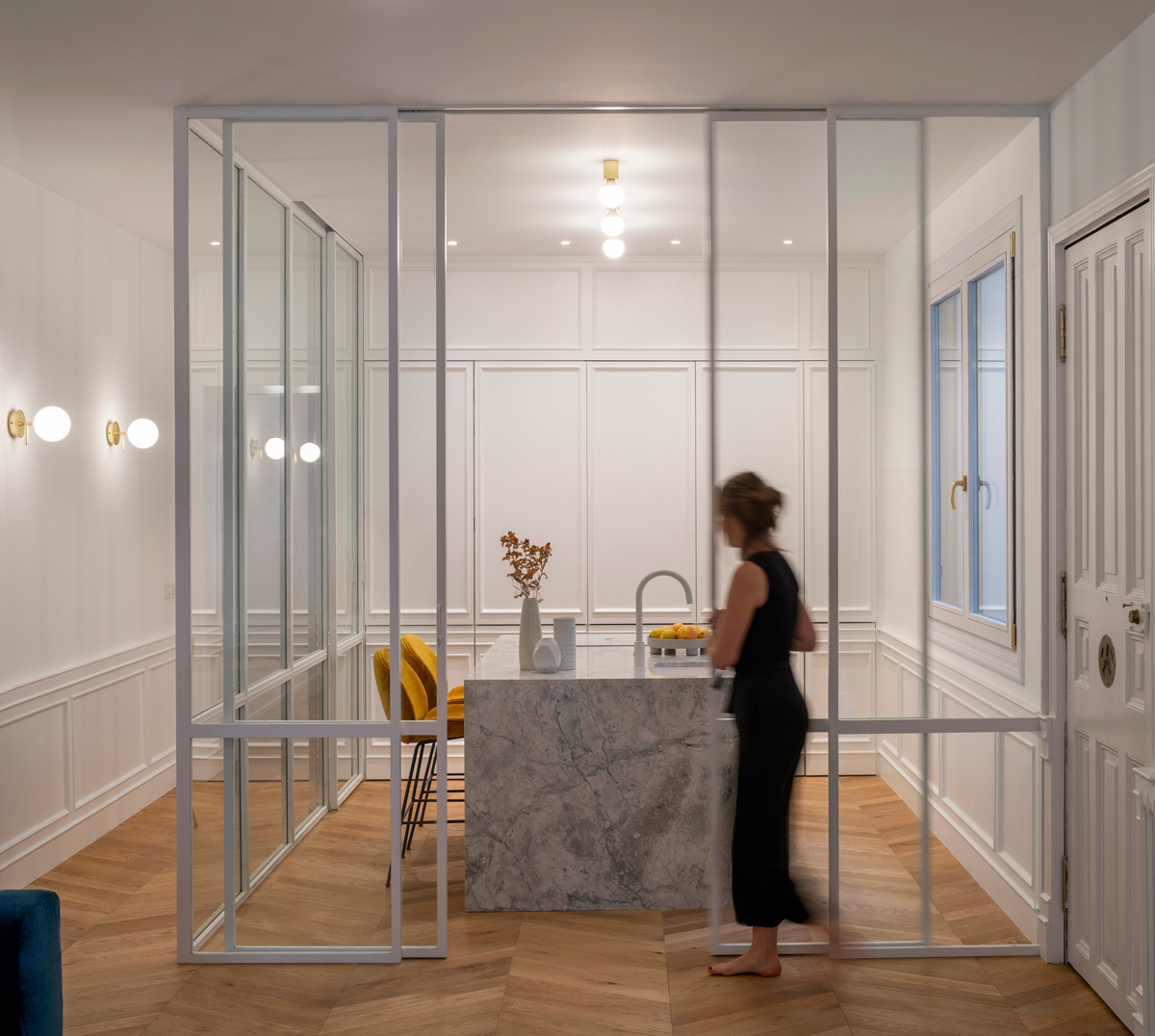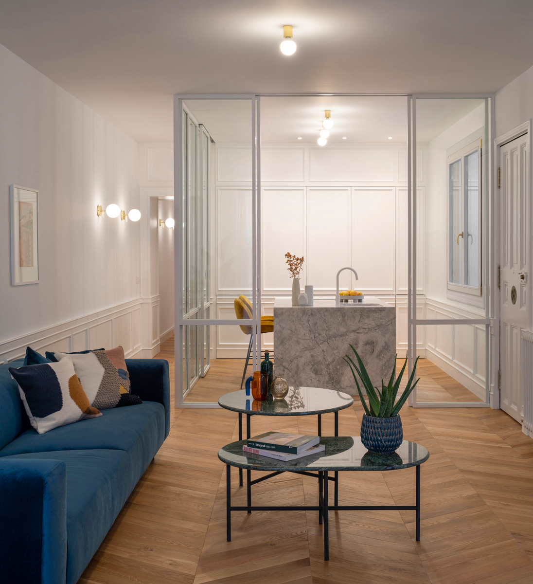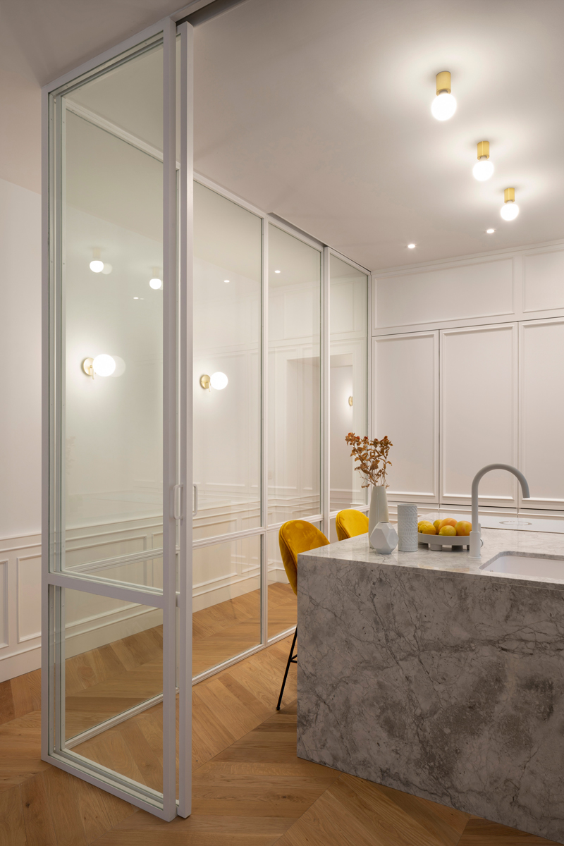 Integramos armarios y electrodomésticos en el frente de puertas molduradas que, a su vez, se integran en el trabajo de carpintería interior de friso y pasos. Isla de cocina en granito con cajones y extracción ocultos.