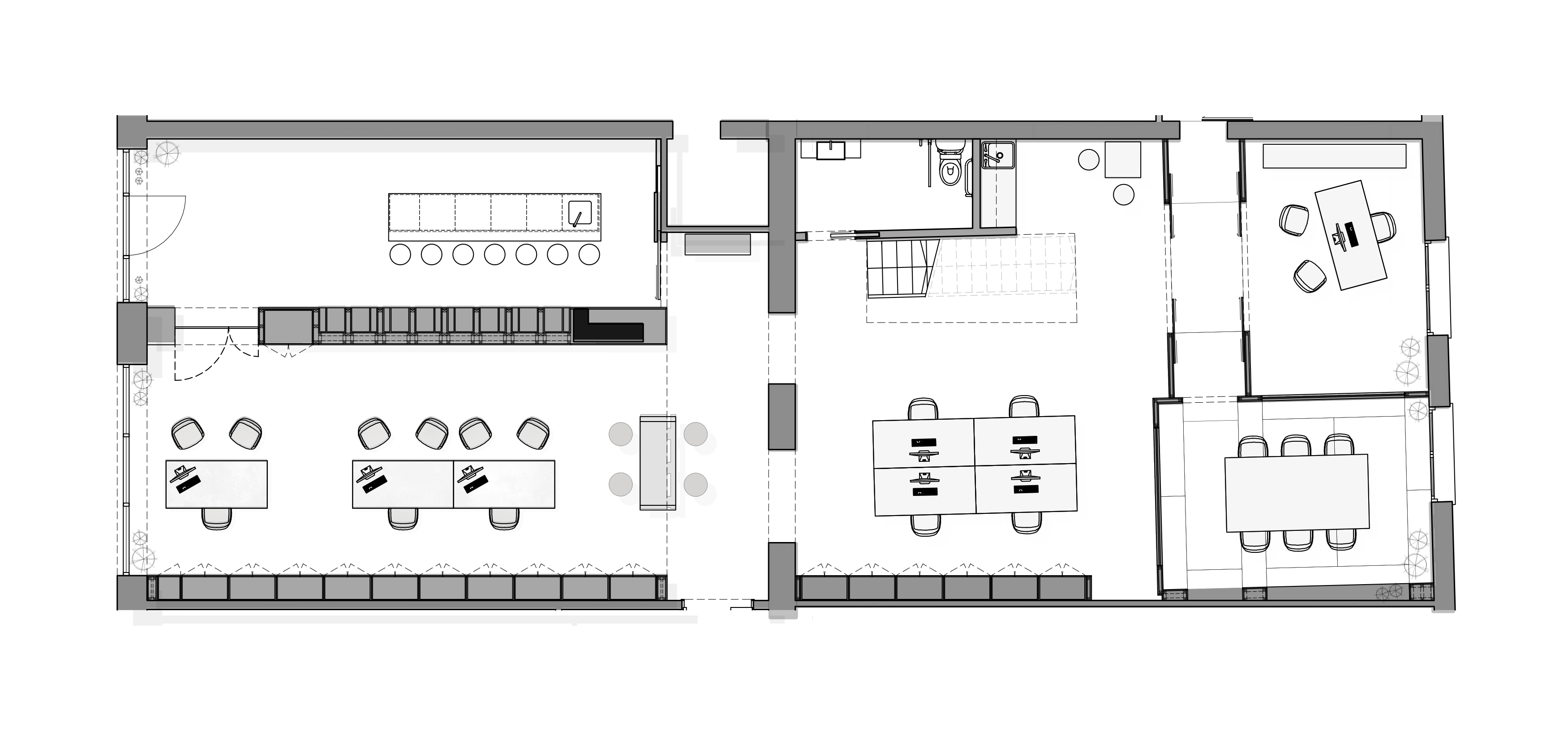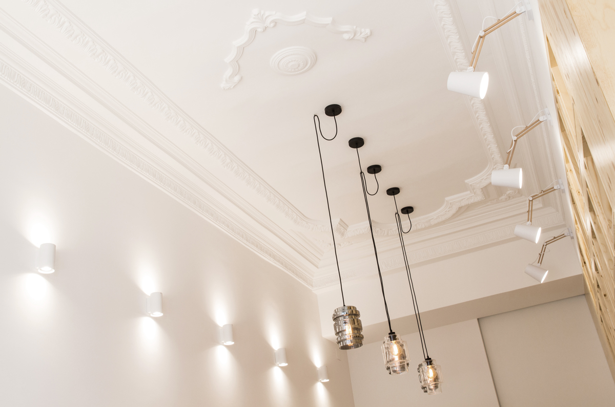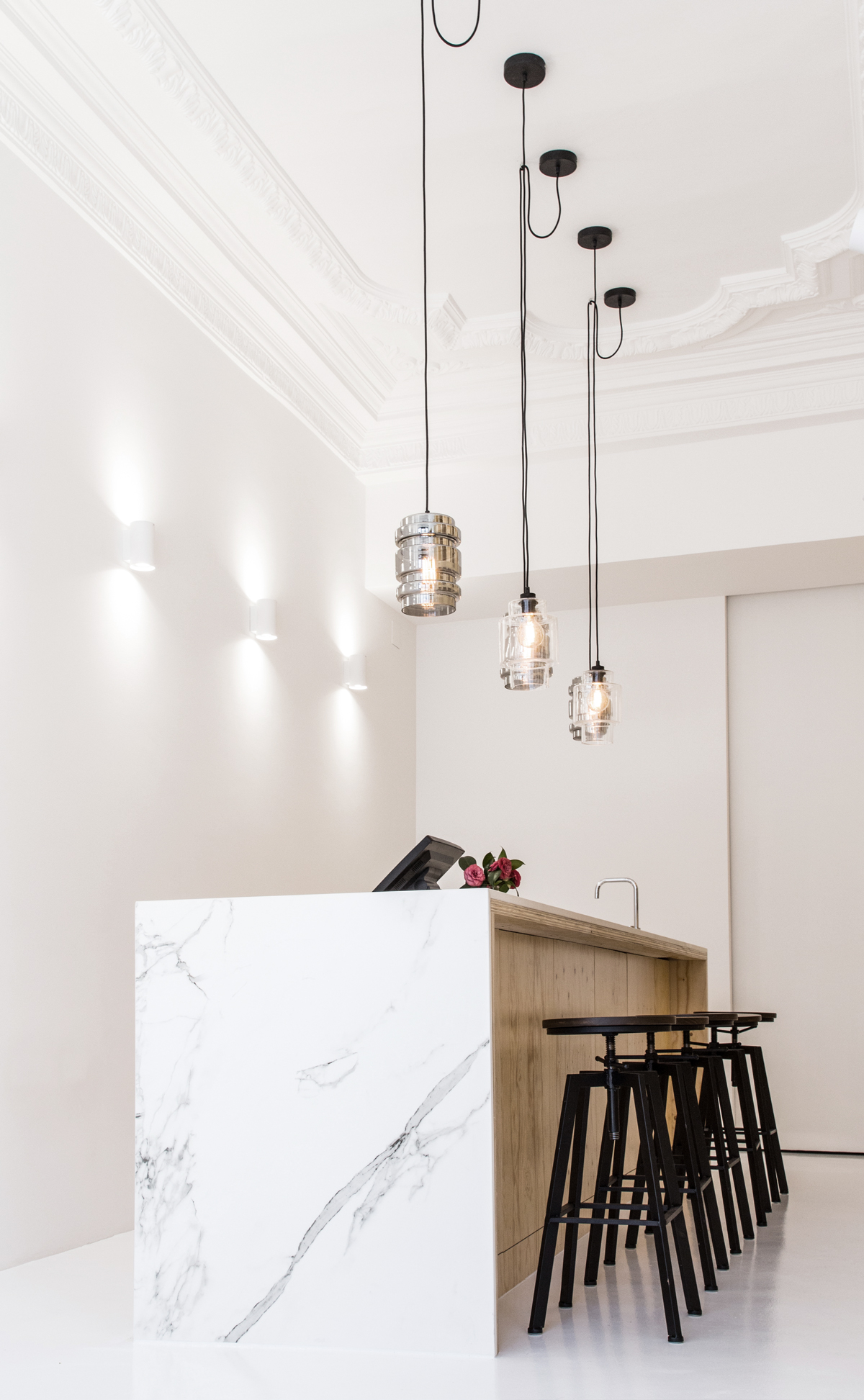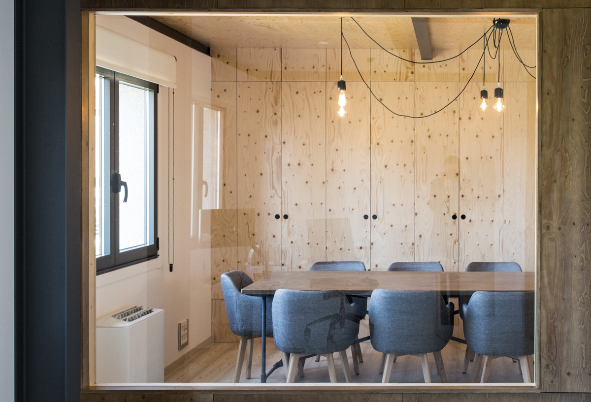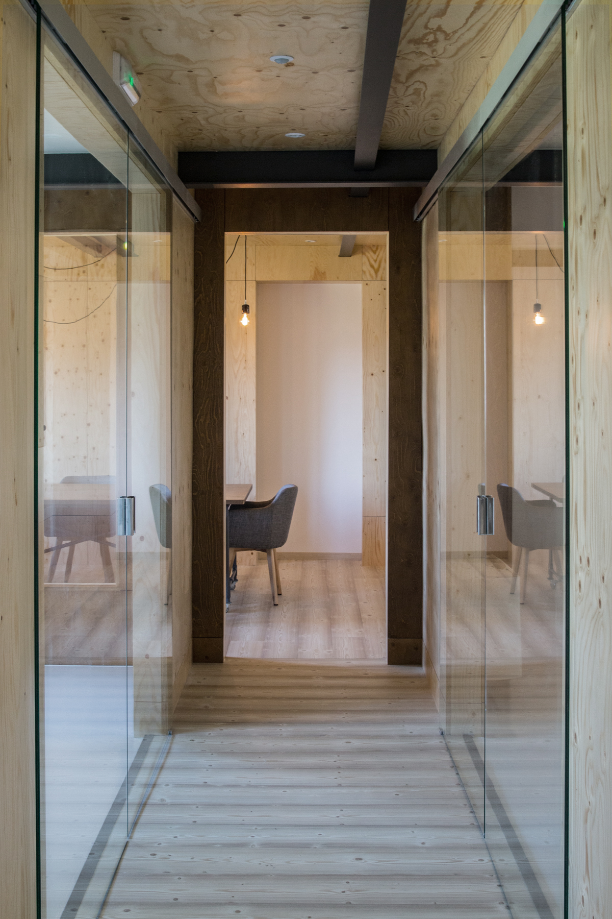 Sobre un espacio diáfano y puramente blanco, proyectamos una serie de ‘cubos’ en madera de pino local que distribuyen el espacio según los diferentes usos, además de integrar el mobiliario de archivo.